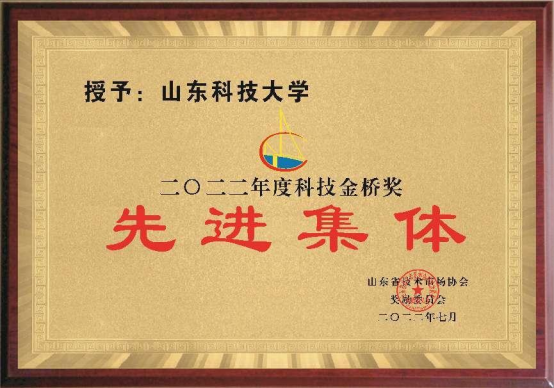 2022年度山东省技术市场协会科技金桥奖评审结果公布,我校荣获山东省技术市场协会科技金桥奖先进集体。该奖项是省科技厅备案的山东省技术市场领域的最高奖项,旨在表彰促进科技成果转化、产学研合作等方面做出突出贡献的集体。