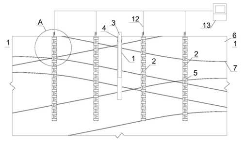(2)本发明在注浆孔周围布置多个隔段式传感器,实现浆液感应元件的三维空间布控。基于此,可在注浆过程中实时监测浆液在三维空间的扩散情况,为注浆机理研究、技术改进、方案优化等提供重要参考。